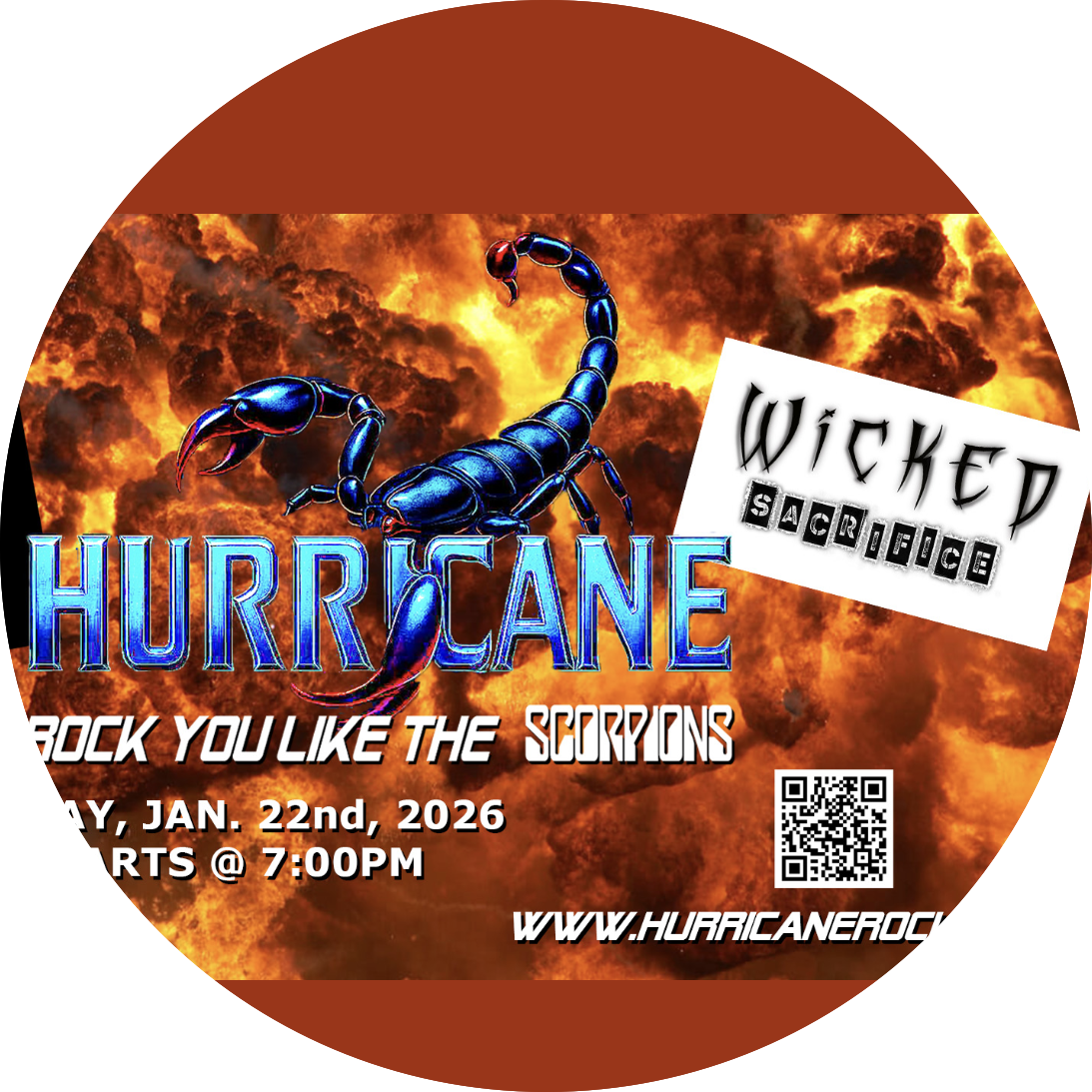 Iron Smoke Distillery 111 Parce Ave, Fairport, New York, United StatesHURRICANE RETURNS TO IRON SMOKE DISTILLERYw/WICKED SACRIFICE!!** IRON SMOKE DISTILLERY111 Parce Ave, Suite 5BFairport, NY 14450-1467 Thursday, Jan. 22nd, 2026+1 585 388 7584 DOORS OPEN @ 4:00 pmSHOW @ 7:00pm This national touring rock band, HURRICANE, is based in New York and performs only the songs of the rock juggernaut, the SCORPIONS, featuring all of […]
